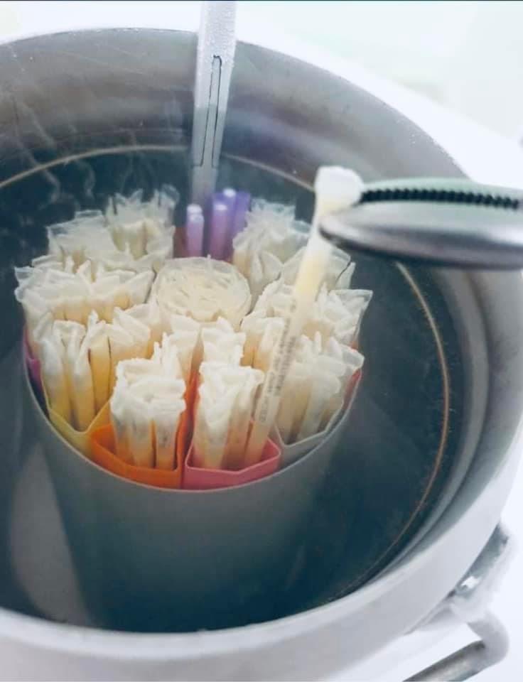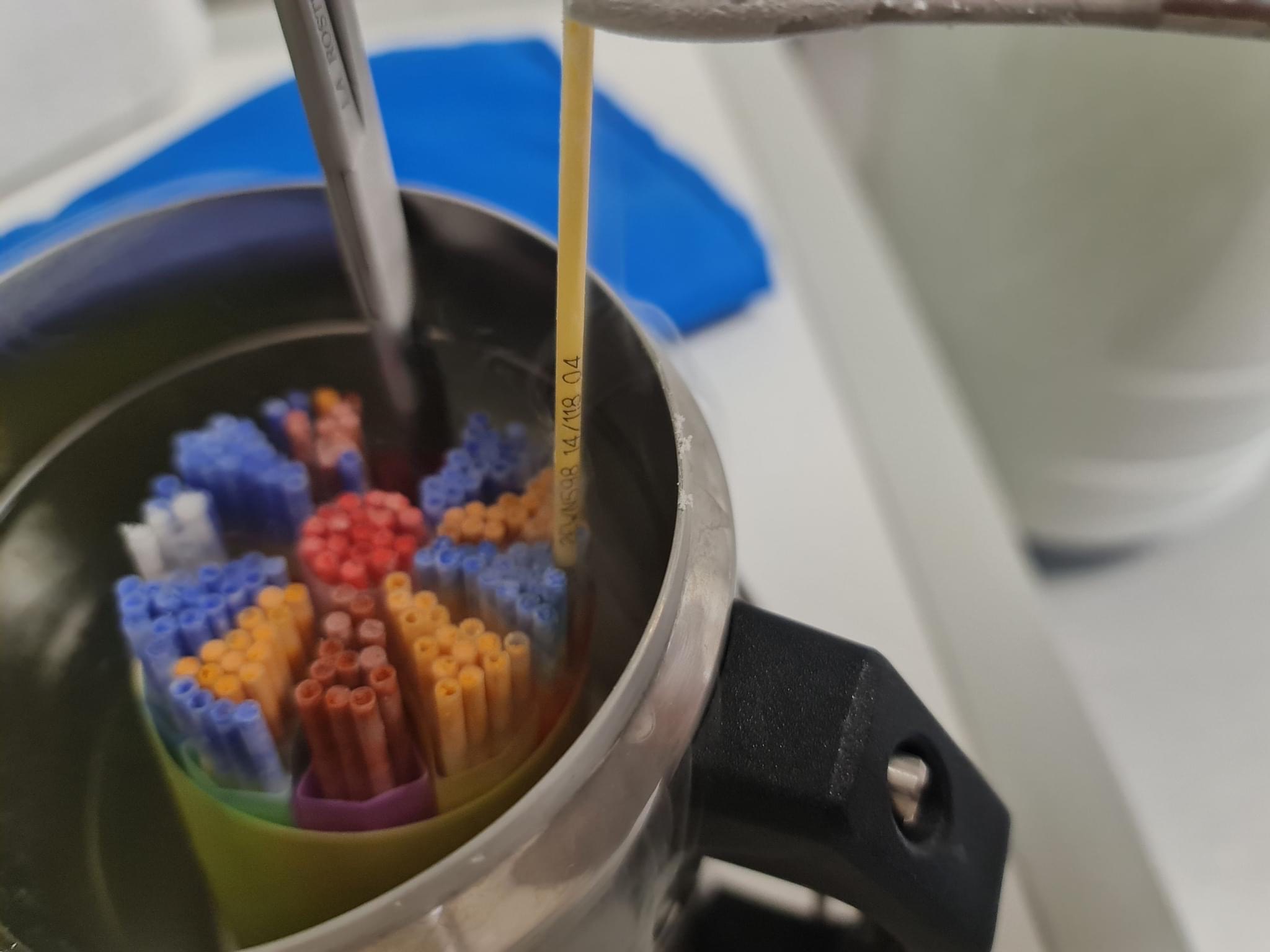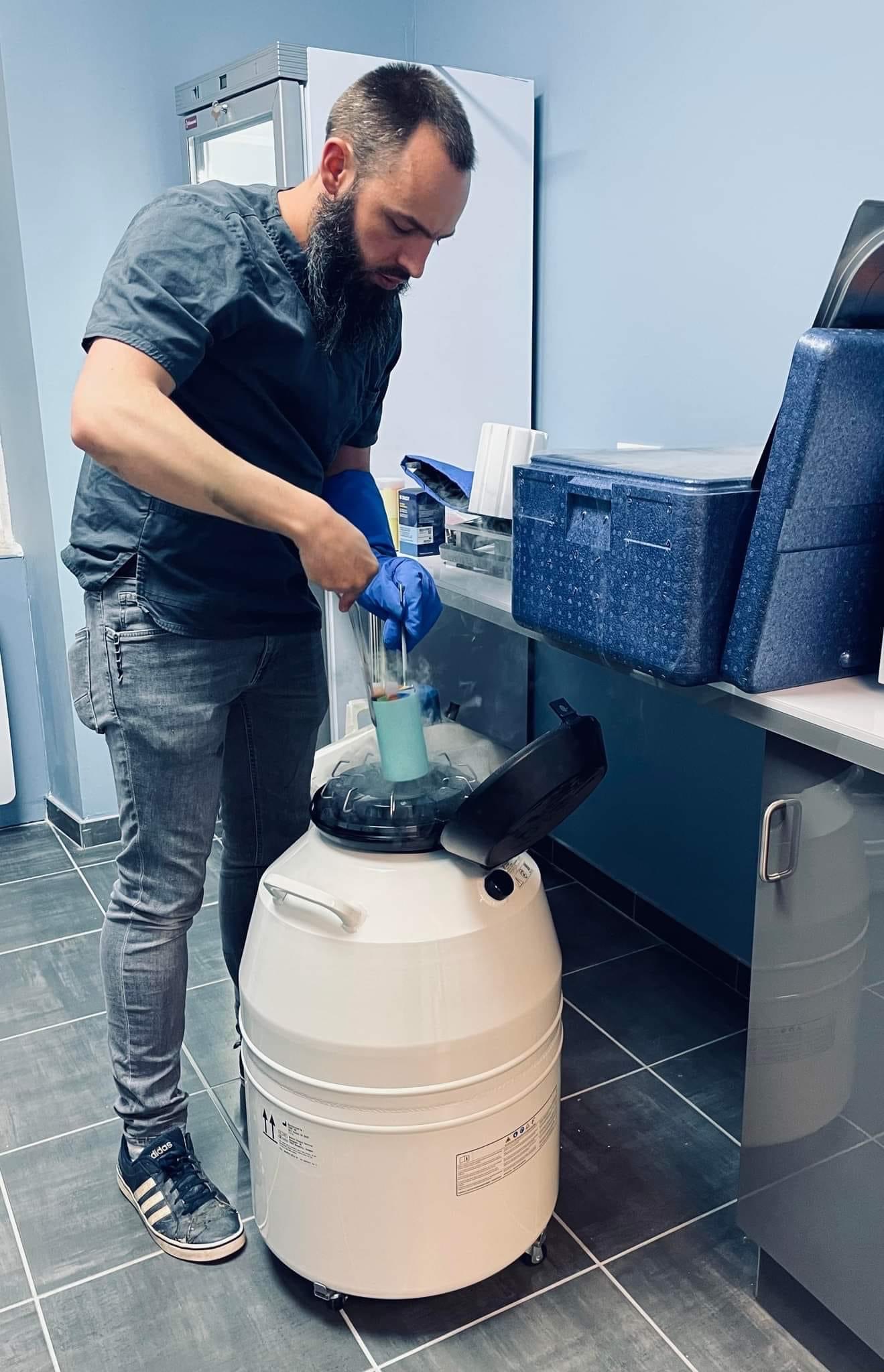 Les paillettes préparées au cabinet sont identifiées grâce à une étiqueteuse spécifique et scellées avec une soudeuse à ultrason pour assurer une étanchéité parfaite de la paillette. Elles sont ensuite stockées dans un visotube dédié à l'étalon dans une cuve d'azote liquide jusqu'à leur utilisation au cabinet ou leur export. Deux semaines après leur congélation, une paillette est sacrifiée pour évaluer la mobilité après décongélation et ainsi déterminer le nombre de doses inséminantes disponibles.